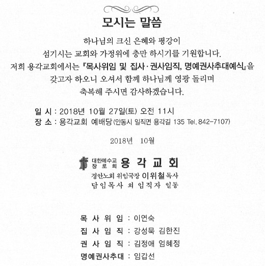 Á¦¸ñ   [ÀϹÝ] ¿ë°¢±³È¸ ¸ñ»çÀ§ÀÓ ¹× ÀÓÁ÷¿¹½Ä(10/27)