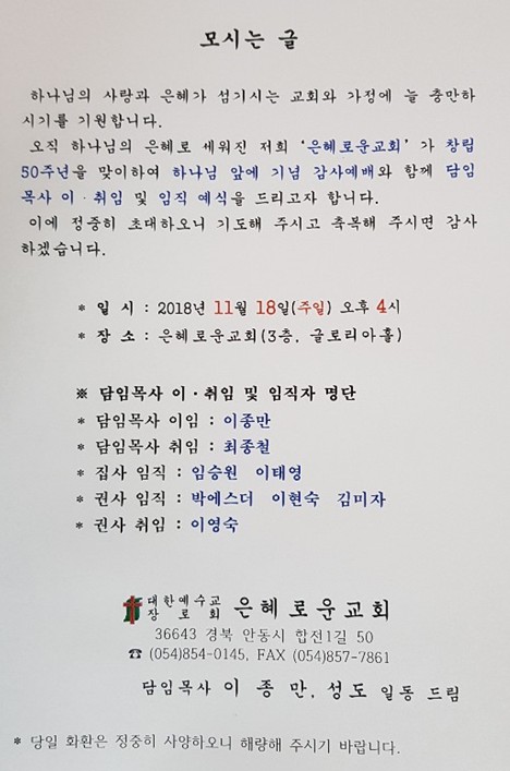 Á¦¸ñ   [ÀϹÝ] ÀºÇý·Î¿î±³È¸ ⸳50ÁÖ³â±â³ä °¨»ç¿¹¹è, ´ãÀÓ¸ñ»ç ÀÌ,ÃëÀÓ ¹× ÀÓÁ÷¿¹½Ä(11/18)
