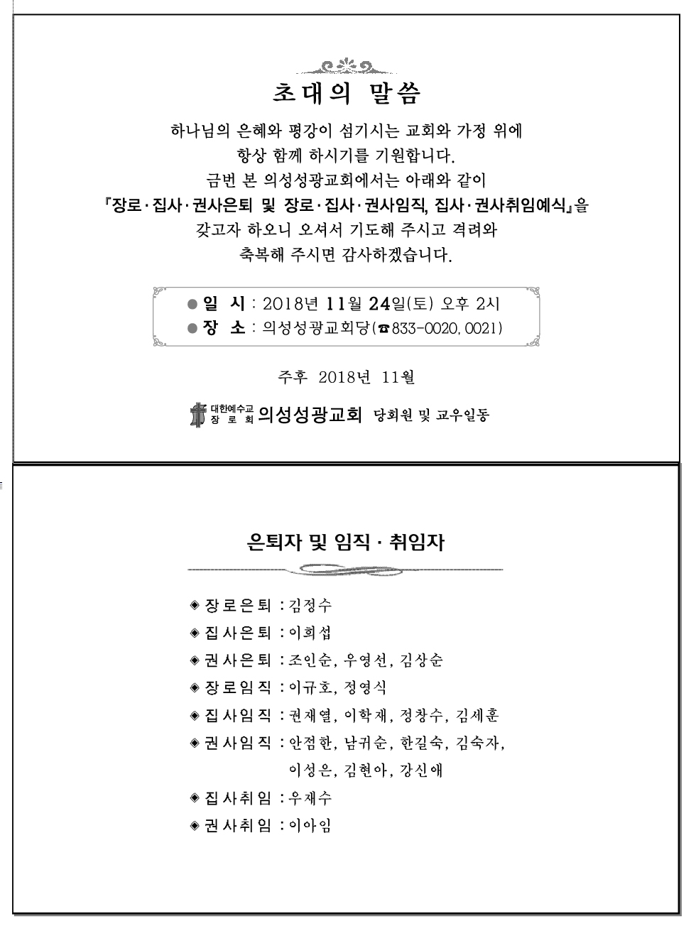 Á¦¸ñ   [ÀϹÝ] ÀǼº¼º±¤±³È¸ ÀºÅð ¹× ÀÓÁ÷¿¹½Ä(11/24)
