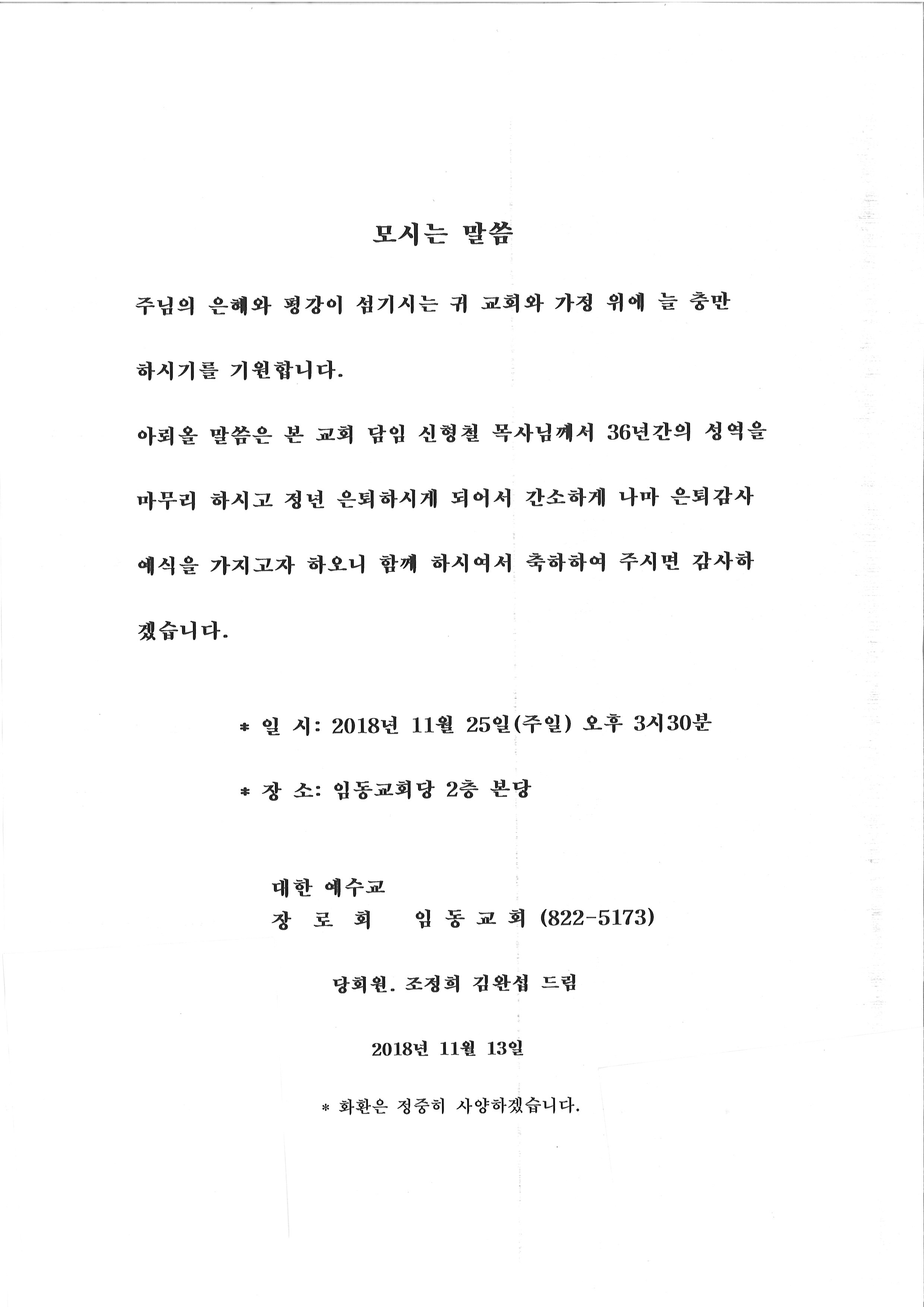 Á¦¸ñ   [ÀϹÝ] ÀÓµ¿±³È¸ ½ÅÇüö ¸ñ»ç ÀºÅ𿹽Ä(11/25)