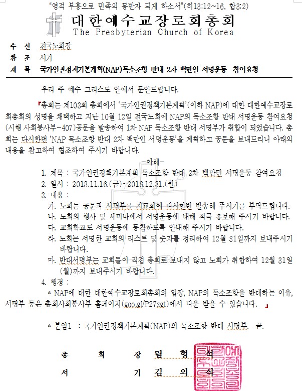 ±¹°¡ÀαÇÁ¤Ã¥±âº»°èȹ(NAP)ÀÇ µ¶¼ÒÁ¶Ç× ¹Ý´ë ¼¸í¿îµ¿ Àû±ØÀûÀÎ Âü¿©¿äû ³ëȸ·ÎºÎÅÍ ¹ÞÀº ¼¸íºÎ(ºÙÀÓ4)¸¦ ÀÛ¼ºÇÏ¿© 12¿ù 28ÀÏ(±Ý)±îÁö °æ¾È³ëȸ »ç¹«½Ç·Î ¿ìÆí ¶Ç´Â ÆÑ½º(854-1347) º¸³»Áֽñ⠹ٶø´Ï´Ù. ±³È¸Çб³µµ ¼¸í¿¡ µ¿ÂüÇÏ¿© Áֽñ⠹ٶø´Ï´Ù.