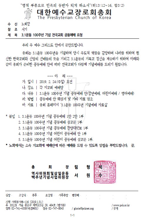3.1¿îµ¿ 100ÁÖ³â±â³ä Àü±¹±³È¸ °øµ¿¿¹¹è ¿äû * ÷ºÎÆÄÀÏÀº ¾Æ·¡ ¸µÅ©¸¦ Ŭ¸¯ÇÏ¸é ´Ù¿î·Îµå µË´Ï´Ù~~ * http://wh.pck.or.kr/pm/linkdown.htm?lid=5c5384ca439660123201