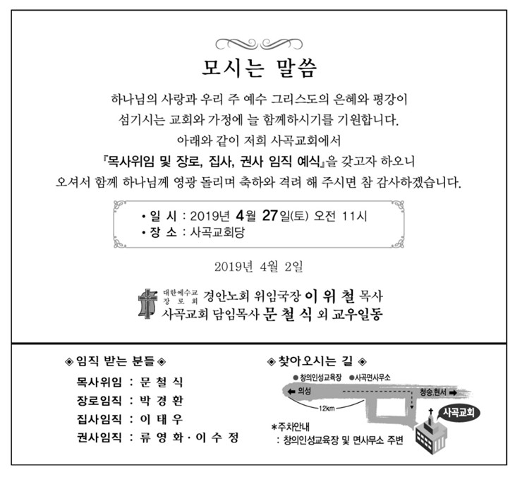Á¦¸ñ   [ÀϹÝ] »ç°î±³È¸ ¸ñ»çÀ§ÀÓ ¹× ÀÓÁ÷¿¹½Ä(4/27)