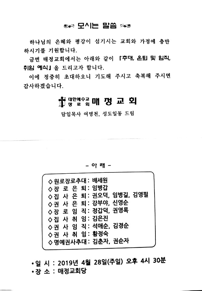 Á¦¸ñ   [ÀϹÝ] ¸ÅÁ¤±³È¸ Ãß´ë,ÀºÅð¹×ÀÓÁ÷,ÃëÀÓ¿¹½Ä(4/28)