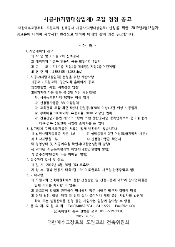 ´ëÇÑ¿¹¼ö±³Àå·Îȸ µµ¿ø±³È¸ ½ÅÃà°ø»ç ½Ã°ø»ç(Áö¸í´ë»ó¾÷ü) ¼±Á¤À» À§ÇÏ¿© ¸ðÁý°ø°í ÇÏ¿À´Ï ÷ºÎÇÑ ÆÄÀÏÀ» ÂüÁ¶ÇϽñ⠹ٶø´Ï´Ù. 2019. 4. 15. ´ëÇÑ¿¹¼ö±³ Àå·Îȸ µµ¿ø±³È¸ ´ç ȸ Àå ¹ÚÀå´ö ¸ñ»ç °ÇÃàÀ§¿øÀå À̱³¼· Àå·Î