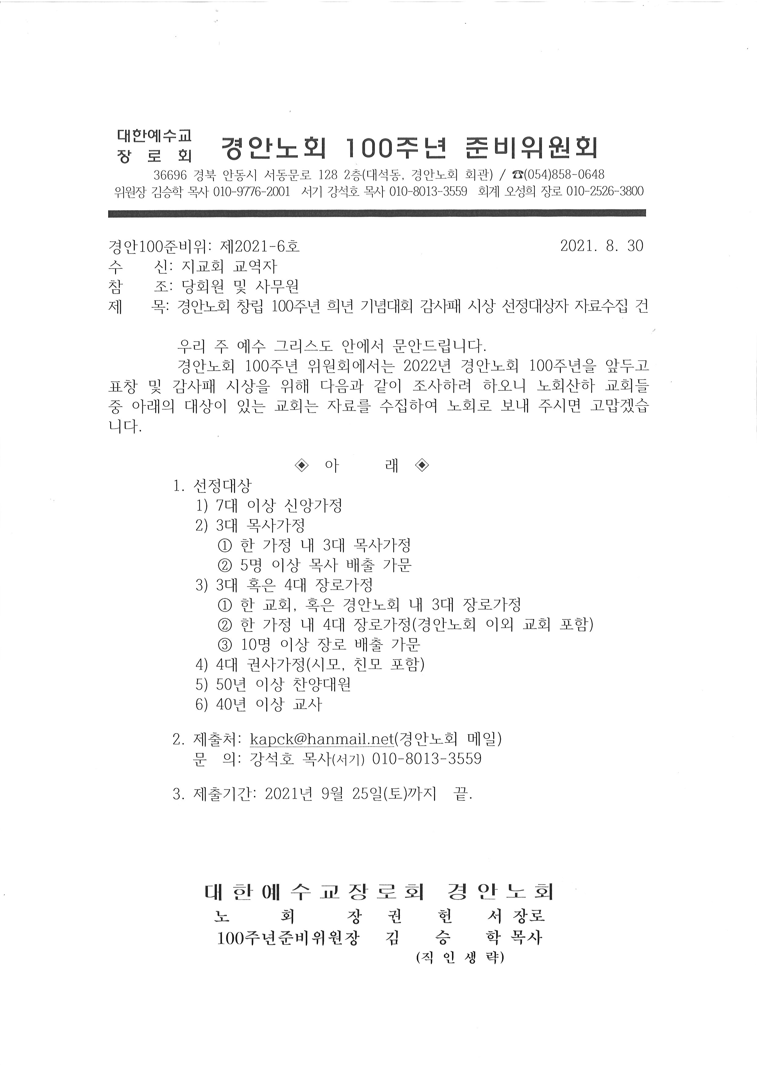 Á¦¸ñ   [°ø¹®] °æ¾È³ëȸ⸳100ÁÖ³âÈñ³â±â³ä´ëȸ°¨»çÆÐ½Ã»ó¼±Á¤´ë»óÀÚÀÚ·á¼öÁý°Ç(9/25±îÁö)