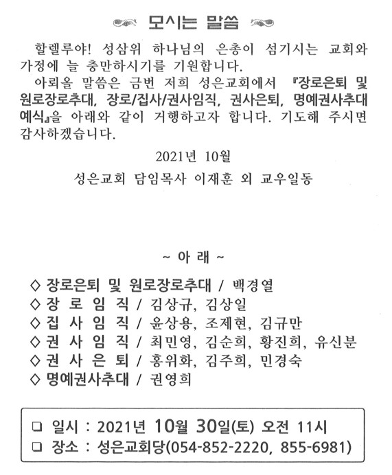Á¦¸ñ   [ÀϹÝ] ¼ºÀº±³È¸ ÀºÅð¹×¿ø·ÎÀå·ÎÃß´ë, ÀÓÁ÷¿¹½Ä(10/30)