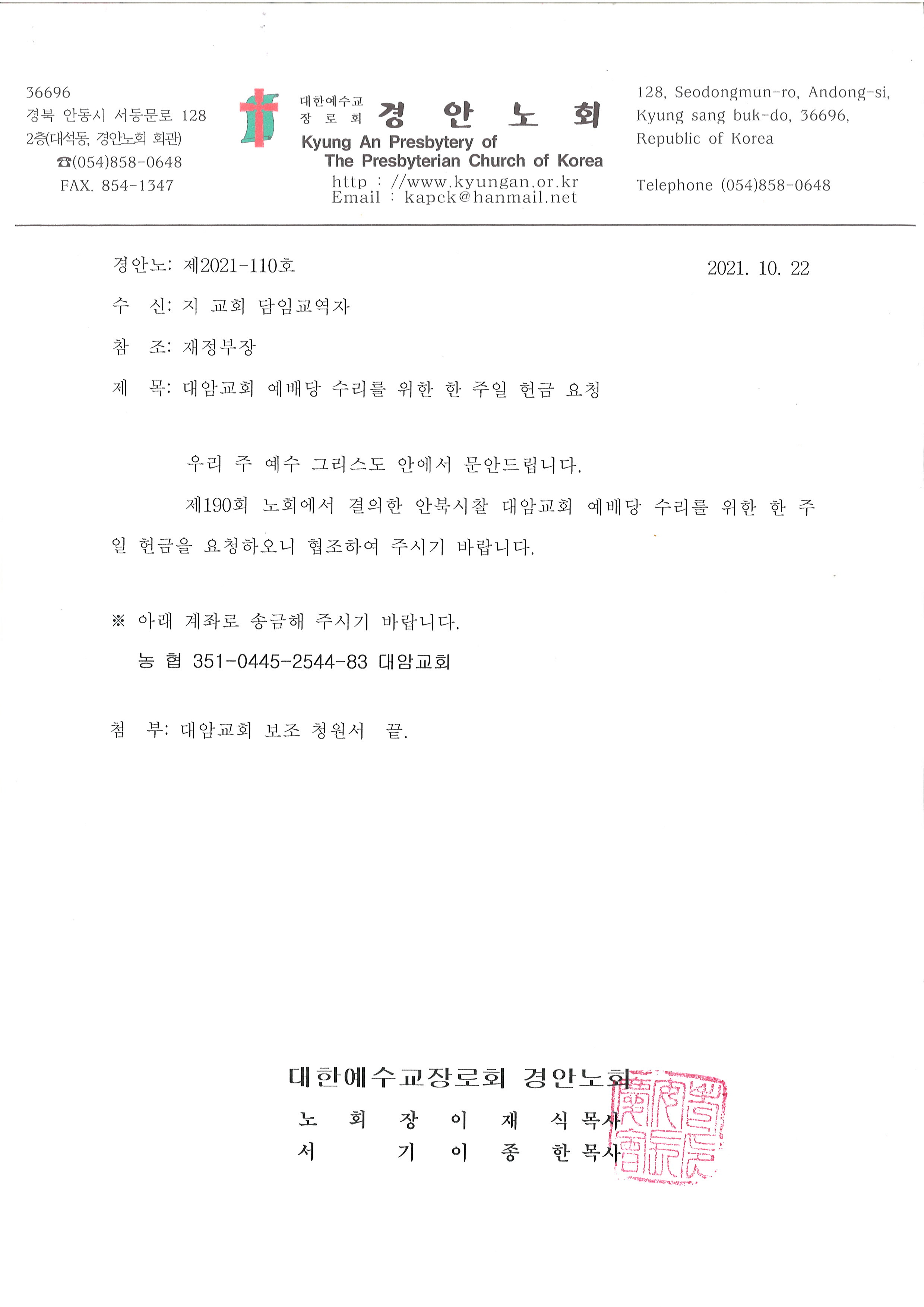 Á¦¸ñ   [°ø¹®] ´ë¾Ï±³È¸ ¿¹¹è´ç ¼ö¸®¸¦ À§ÇÑ ÇÑÁÖÀÏ Çå±Ý ¿äû