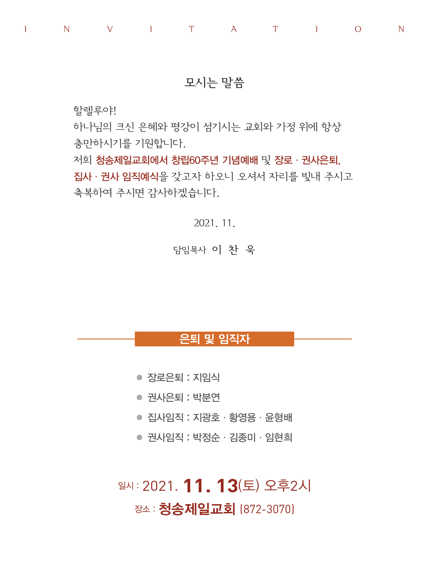 Á¦¸ñ   [°ø¹®] û¼ÛÁ¦Àϱ³È¸ ⸳60Áֳ⠱â³ä¿¹¹è ¹× ÀºÅð, ÀÓÁ÷¿¹½Ä(11/13)