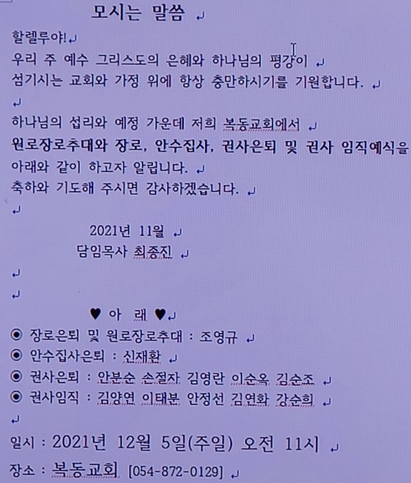 Á¦¸ñ   [°ø¹®] º¹µ¿±³È¸ ¿ø·ÎÀå·ÎÃß´ë, ÀºÅð ¹× ÀÓÁ÷¿¹½Ä(12/5)