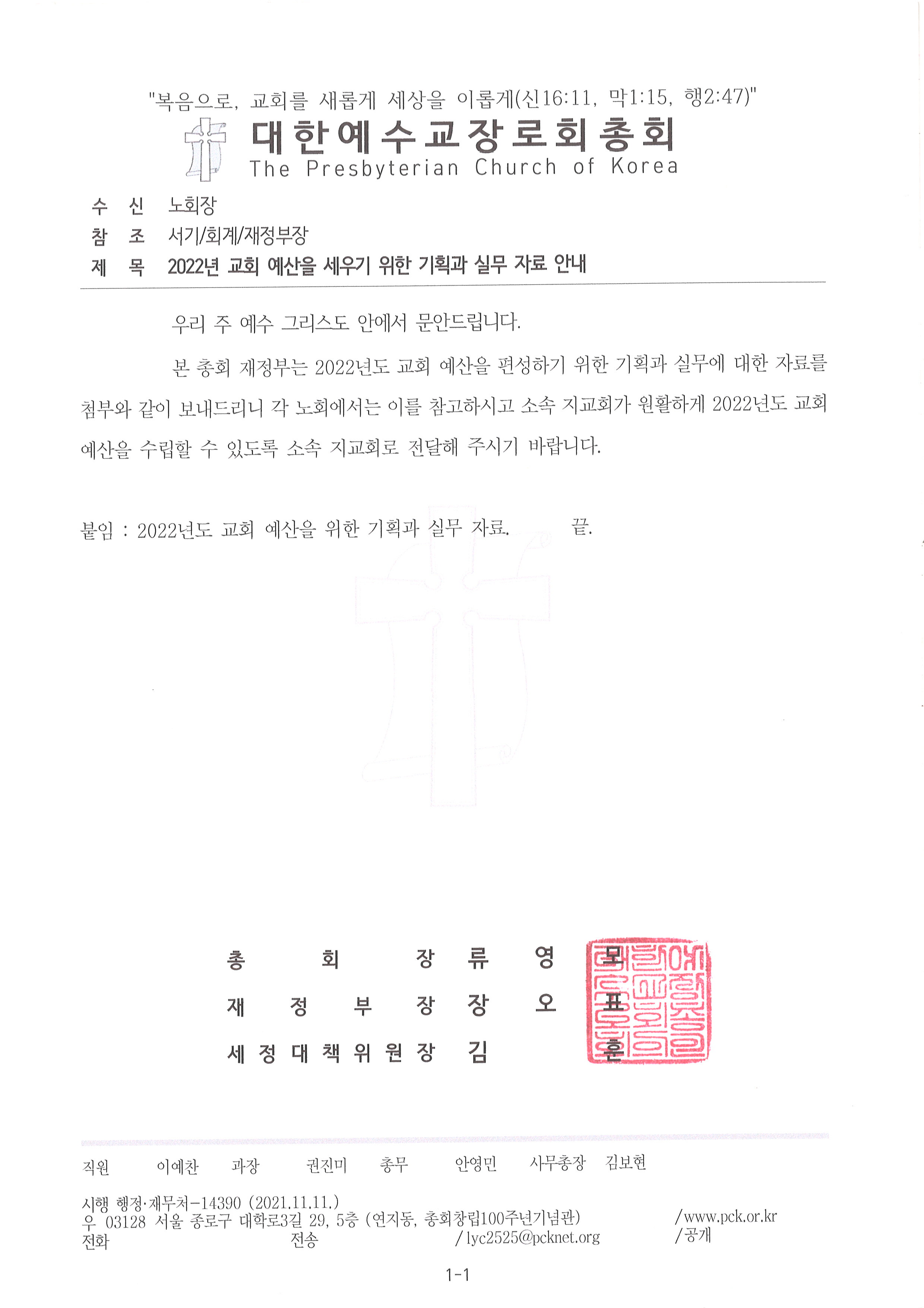 Á¦¸ñ   [°ø¹®] 2022³â ±³È¸ ¿¹»êÀ» ¼¼¿ì±â À§ÇÑ ±âȹ°ú ½Ç¹« ÀÚ·á ¾È³»