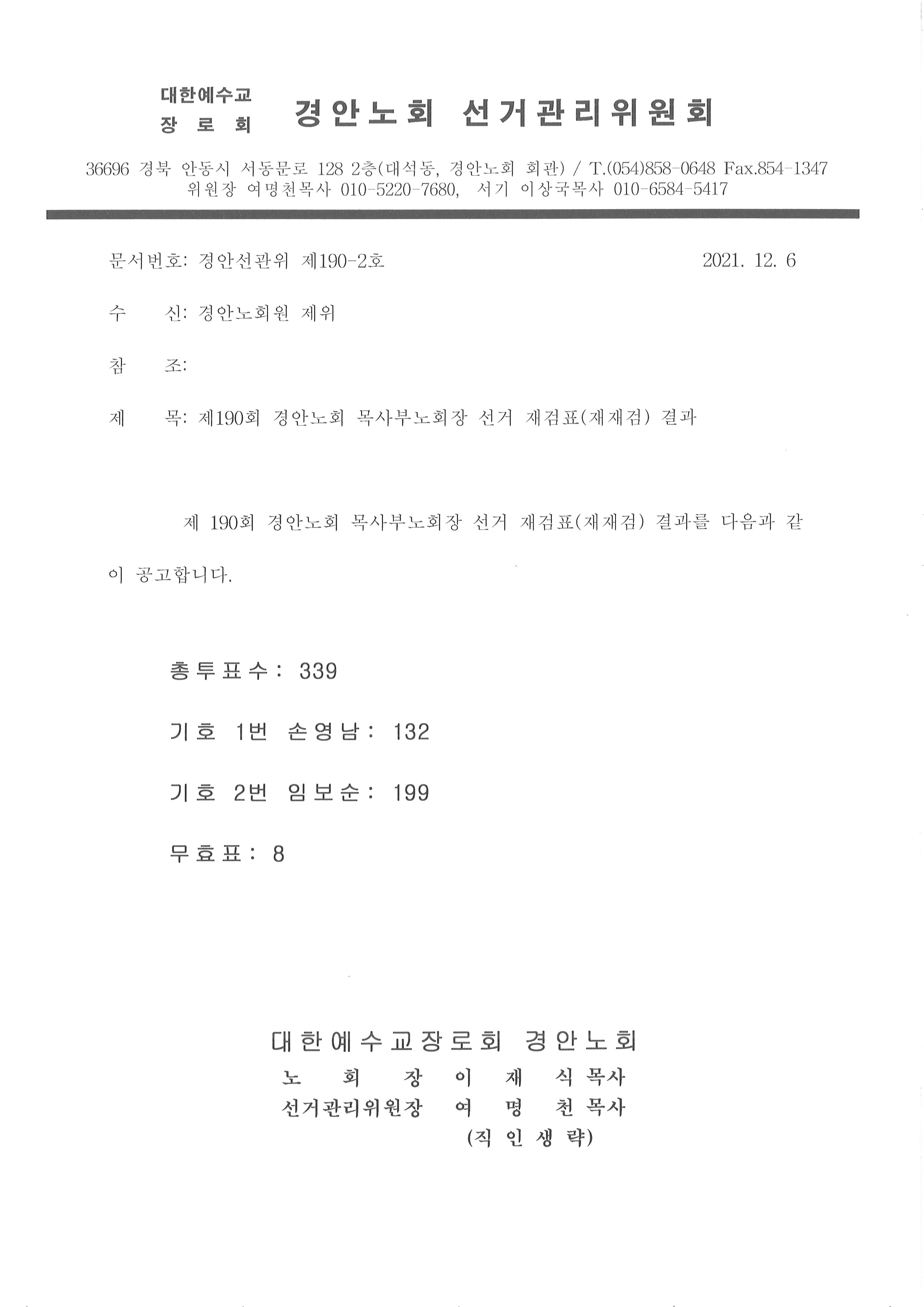 Á¦¸ñ   [°ø¹®] Á¦190ȸ °æ¾È³ëȸ ¸ñ»çºÎ³ëȸÀå ¼±°Å Àç°ËÇ¥(ÀçÀç°Ë) °á°ú