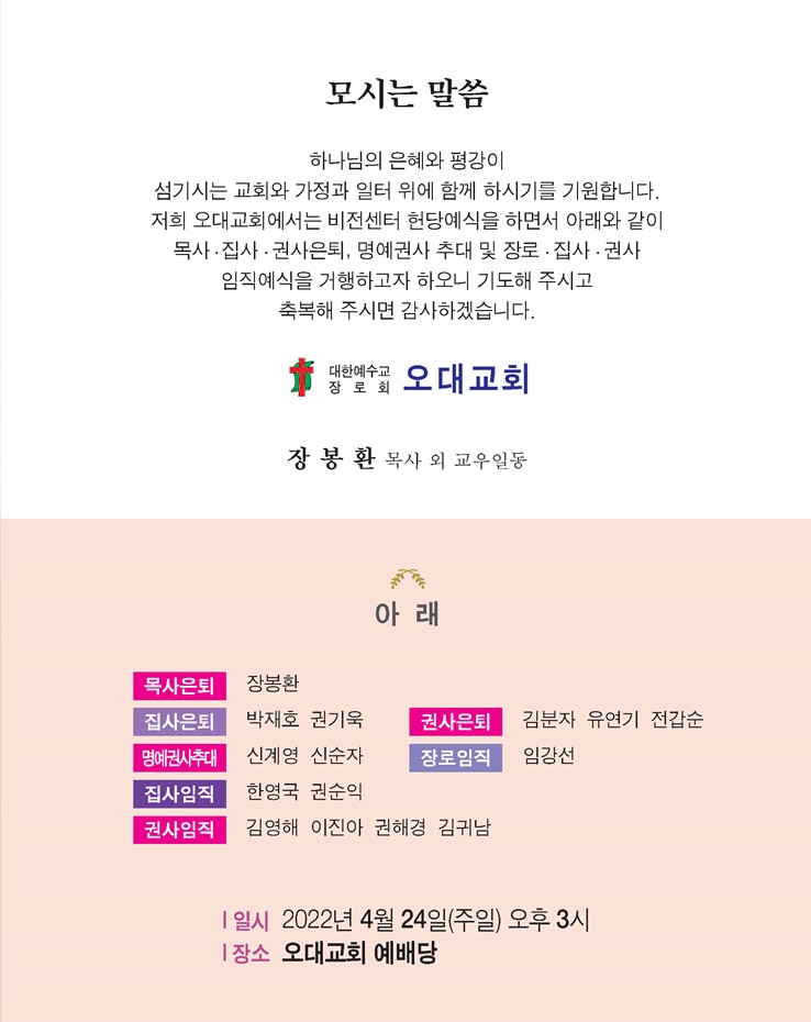 Á¦¸ñ   [°ø¹®] ¿À´ë±³È¸ ºñÀü¼¾ÅÍ Çå´ç½Ä, ¸ñ»ç.Áý»ç.±Ç»ç ÀºÅð ¹× Àå·Î.Áý»ç.±Ç»ç ÀÓÁ÷¿¹½Ä(4/24)