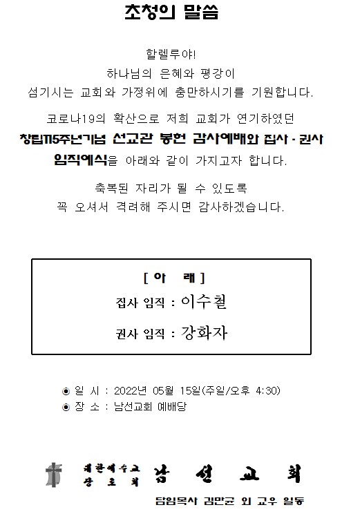 Á¦¸ñ   [°ø¹®] ³²¼±±³È¸ ⸳115ÁÖ³â±â³ä ¼±±³°ü ºÀÇå °¨»ç¿¹¹è¿Í Áý»ç,±Ç»ç ÀÓÁ÷¿¹½Ä(5/15)