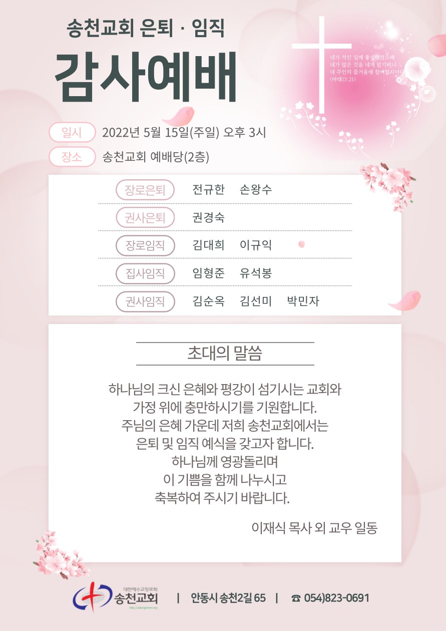 Á¦¸ñ   [°ø¹®] ¼Ûõ±³È¸ ÀºÅð,ÀÓÁ÷ °¨»ç¿¹¹è(5/15)