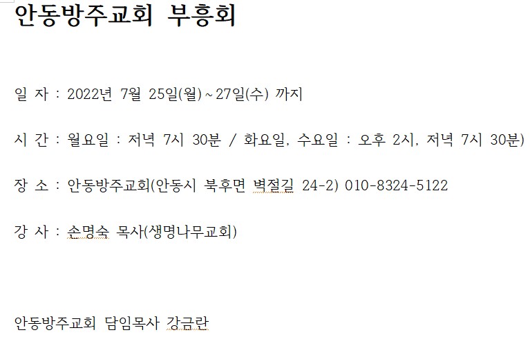 Á¦¸ñ   [°ø¹®] ¾Èµ¿¹æÁÖ±³È¸ ºÎÈïȸ(7/25-27)