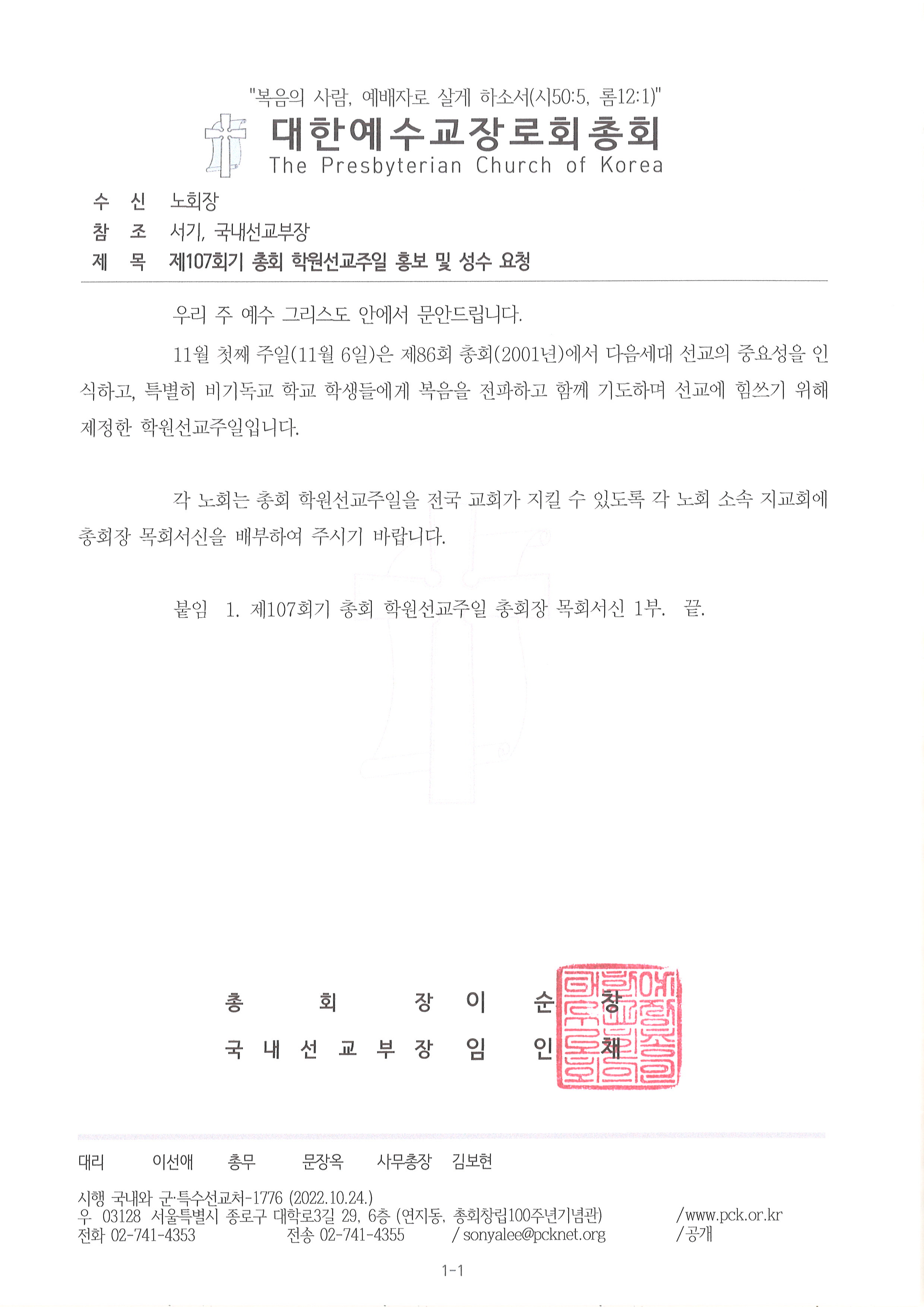 Á¦¸ñ   [°ø¹®] Á¦107ȸ±â ÃÑȸ Çпø¼±±³ÁÖÀÏ(11/6) È«º¸ ¹× ¼º¼ö ¿äû