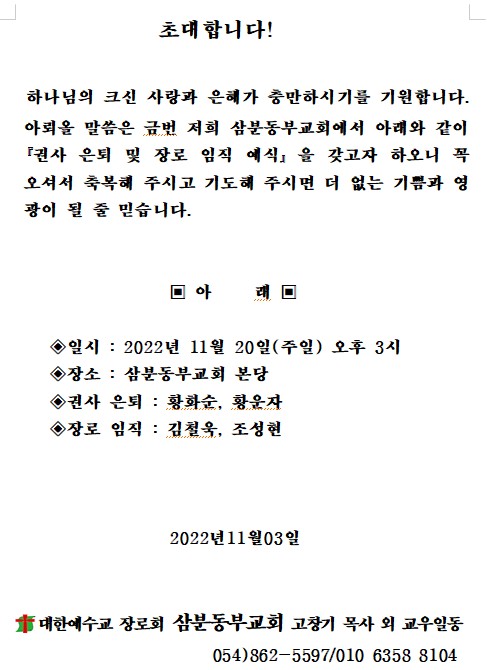 Á¦¸ñ   [°ø¹®] »ïºÐµ¿ºÎ±³È¸ ±Ç»çÀºÅð ¹× Àå·ÎÀÓÁ÷¿¹½Ä(11/20)