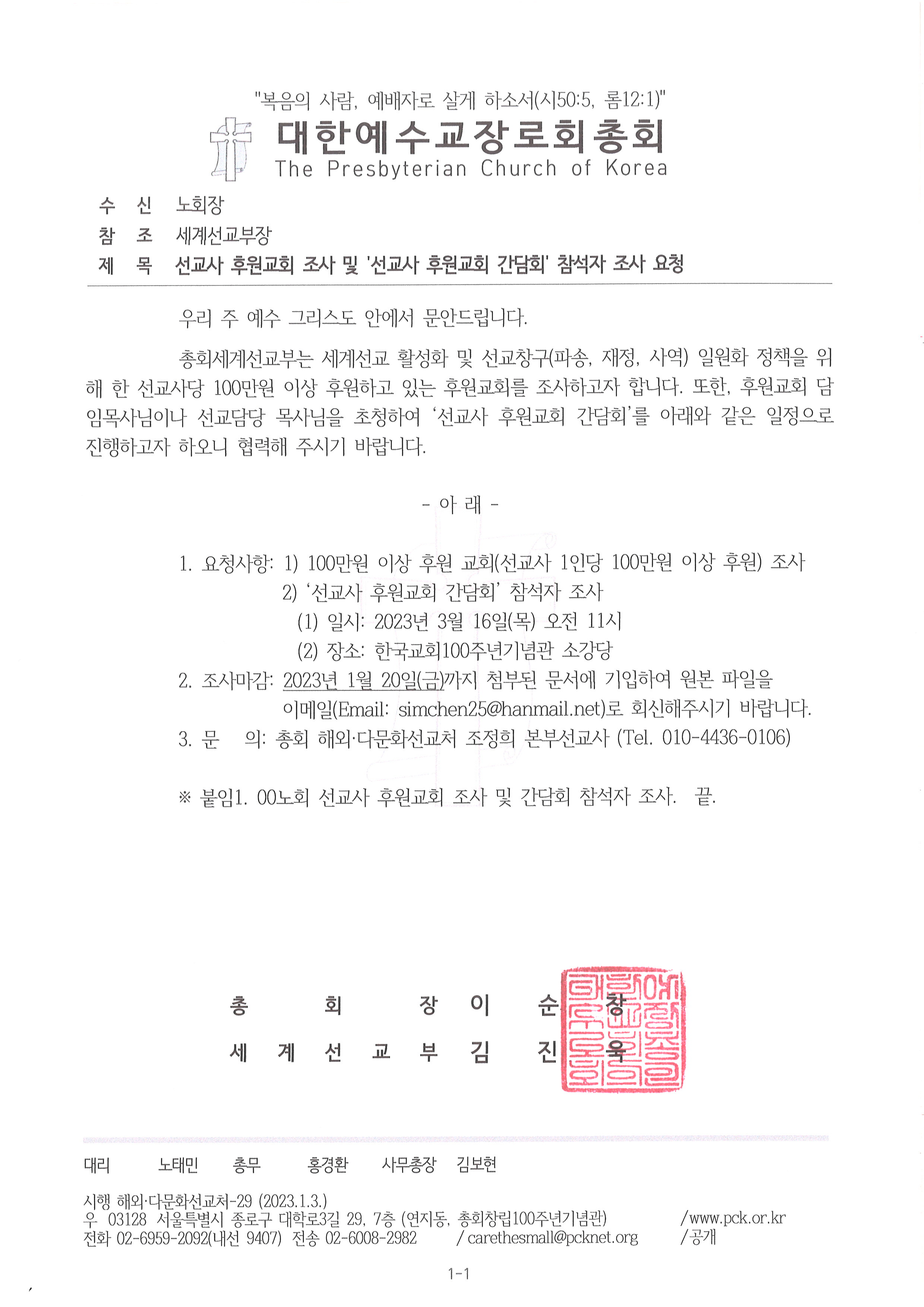 Á¦¸ñ   [°ø¹®] ¼±±³»çÈÄ¿ø±³È¸Á¶»ç(1/20±îÁö)¹× '¼±±³»çÈÄ¿ø±³È¸°£´ãȸ(3/16)' Âü¼®ÀÚÁ¶»ç ¿äû