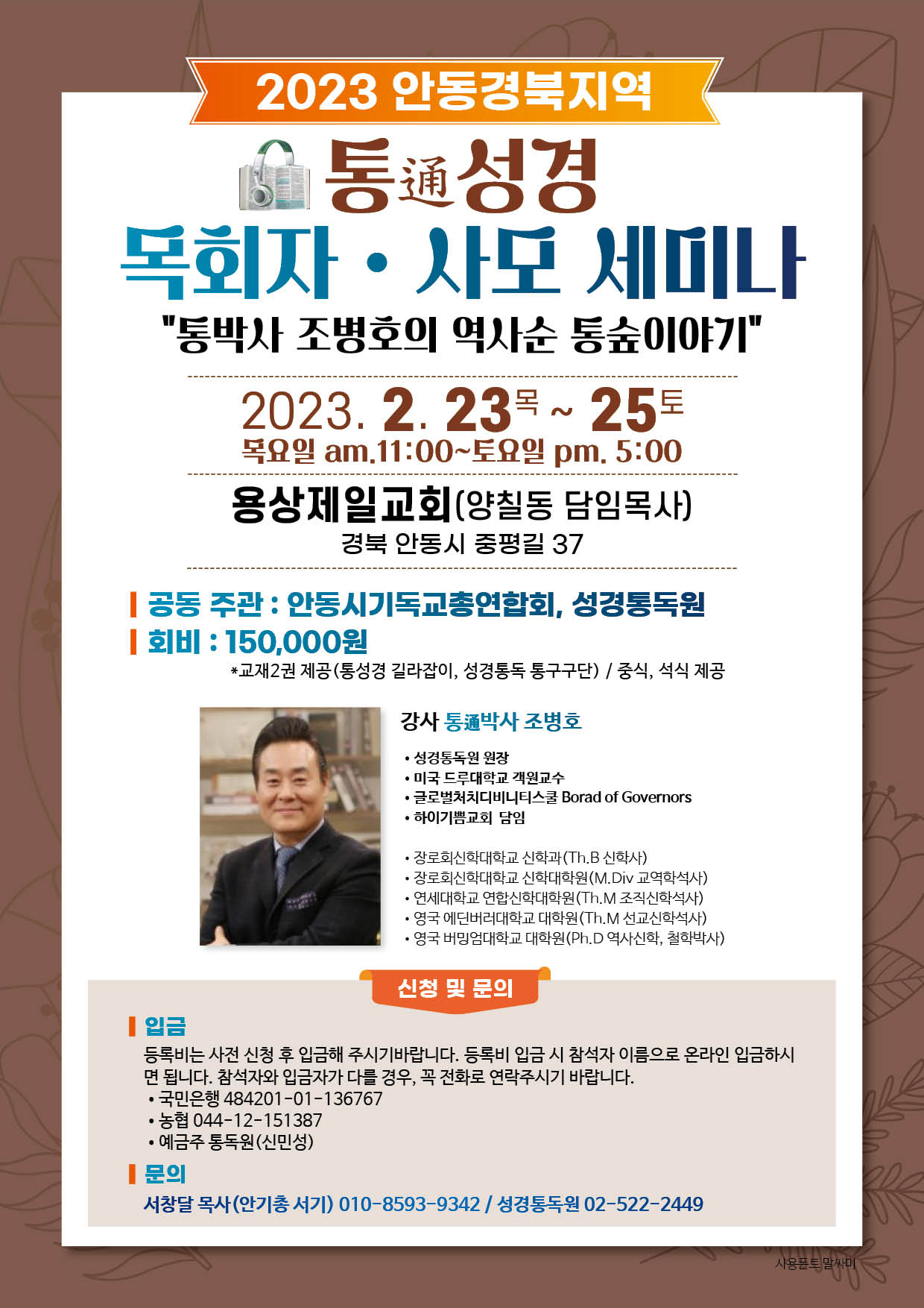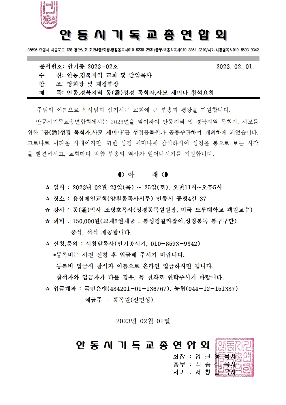 Á¦¸ñ   [°ø¹®] ¾Èµ¿,°æºÏÁö¿ª Åë(÷×)¼º°æ ¸ñȸÀÚ, »ç¸ð ¼¼¹Ì³ª(2/23-25)