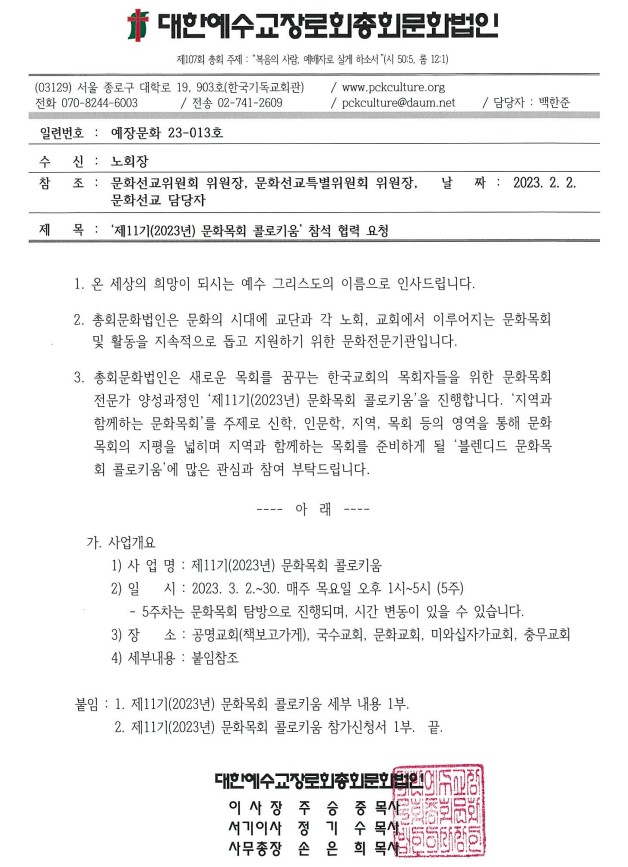 Á¦¸ñ   [°ø¹®] Á¦11±â(2023³â) ¹®È­¸ñȸ ÄÝ·ÎŰ¿ò Âü¼® Çù·Â ¿äû(3.2-30)