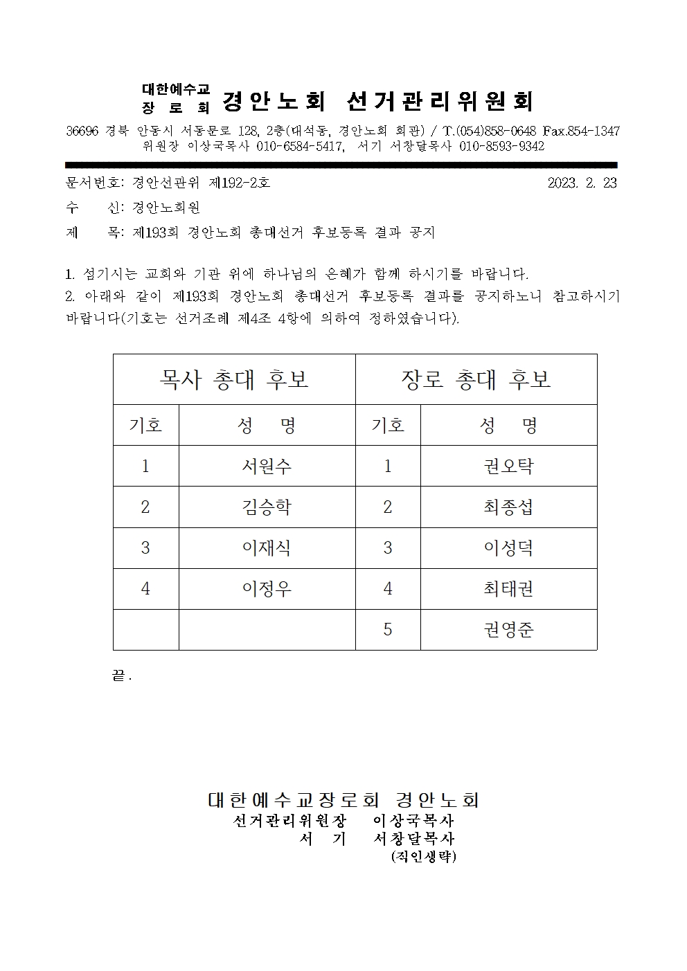Á¦¸ñ   [°ø¹®] Á¦193ȸ °æ¾È³ëȸ ÃÑ´ë¼±°Å È帵î·Ï °á°ú °øÁö