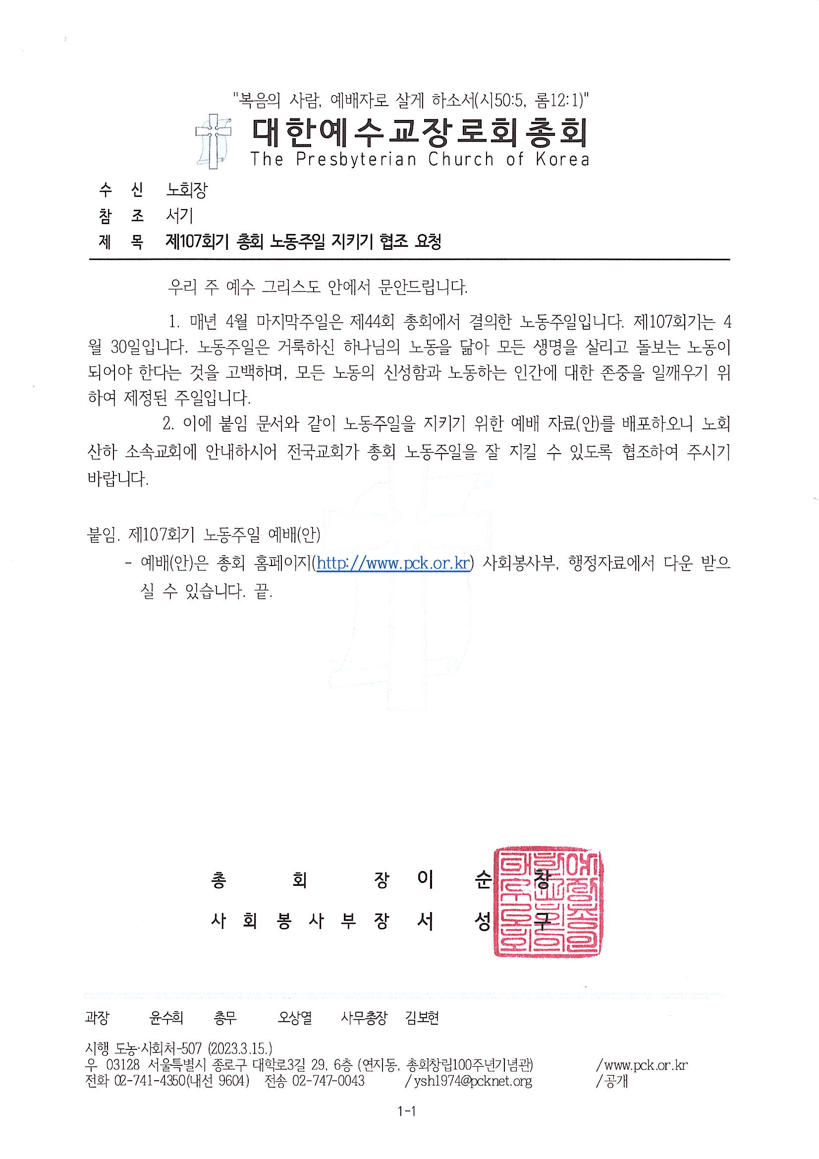 Á¦107ȸ ³ëµ¿ÁÖÀÏ ¿¹¹è(¾È) (pck.or.kr)