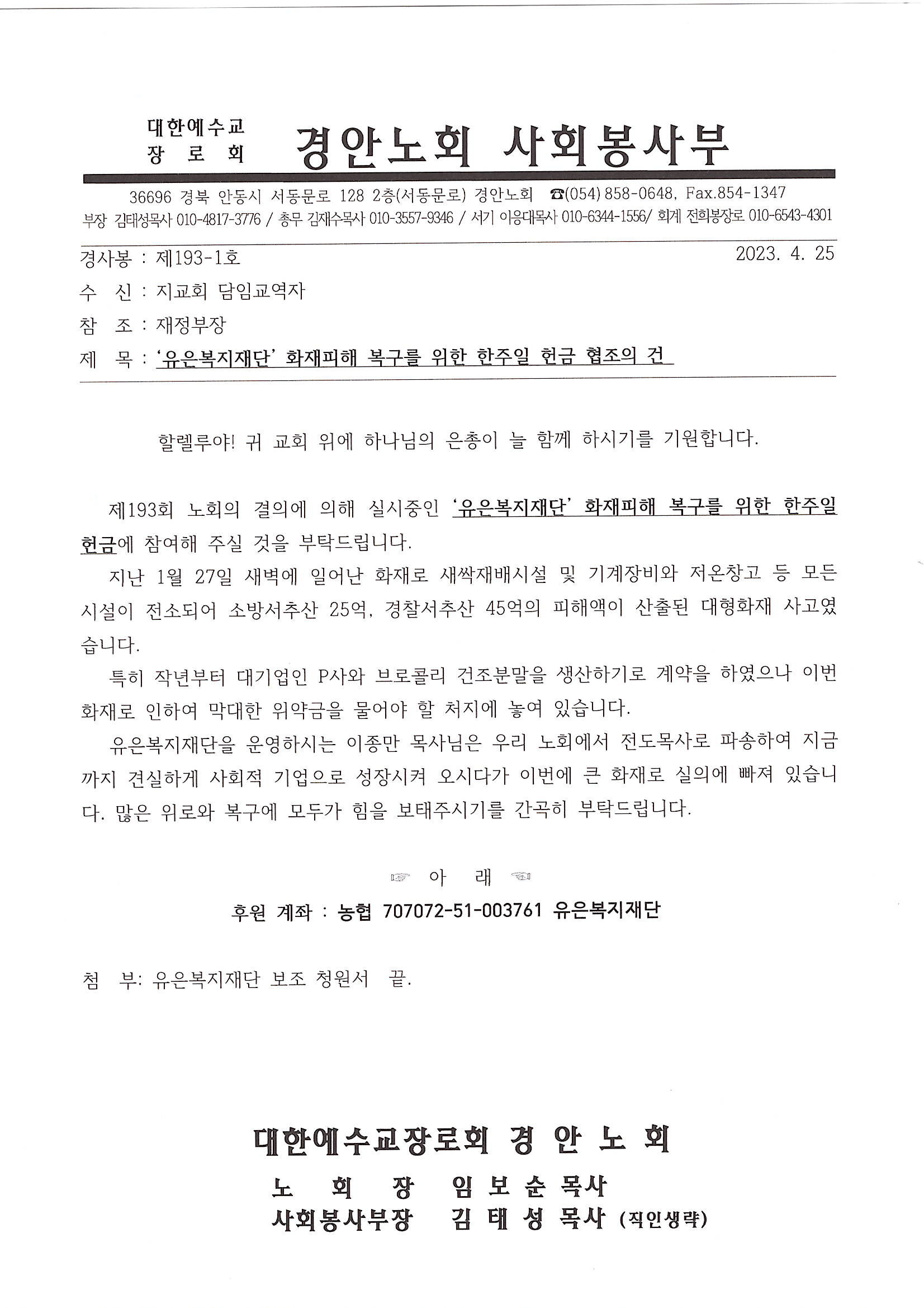 Á¦¸ñ   [°ø¹®] 'À¯Àºº¹ÁöÀç´Ü' È­ÀçÇÇÇØ º¹±¸¸¦ À§ÇÑ ÇÑÁÖÀÏ Çå±Ý ÇùÁ¶ÀÇ °Ç