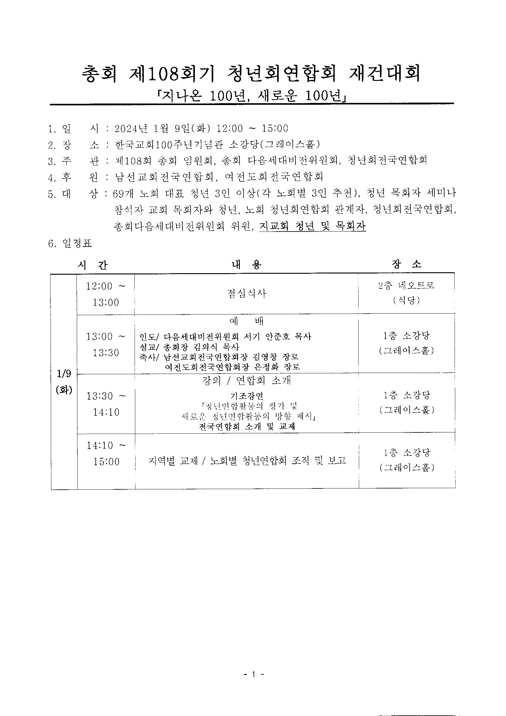 Á¦¸ñ   [°ø¹®] ÃÑȸ Á¦108ȸ±â û³âȸ¿¬ÇÕȸ Àç°Ç´ëȸ(1/9) Âü¼® ¾È³»(Áö±³È¸ û³â ¹× ¸ñȸÀÚ)