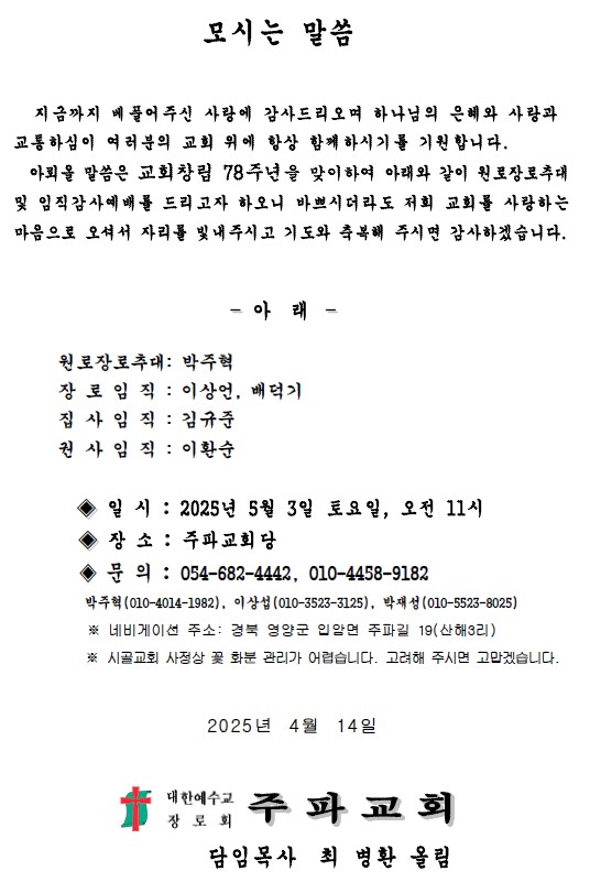 Á¦¸ñ   [°ø¹®] Á֯ı³È¸ ⸳78ÁÖ³â±â³ä ¿ø·ÎÀå·ÎÃß´ë ¹× ÀÓÁ÷°¨»ç¿¹¹è(5/3)