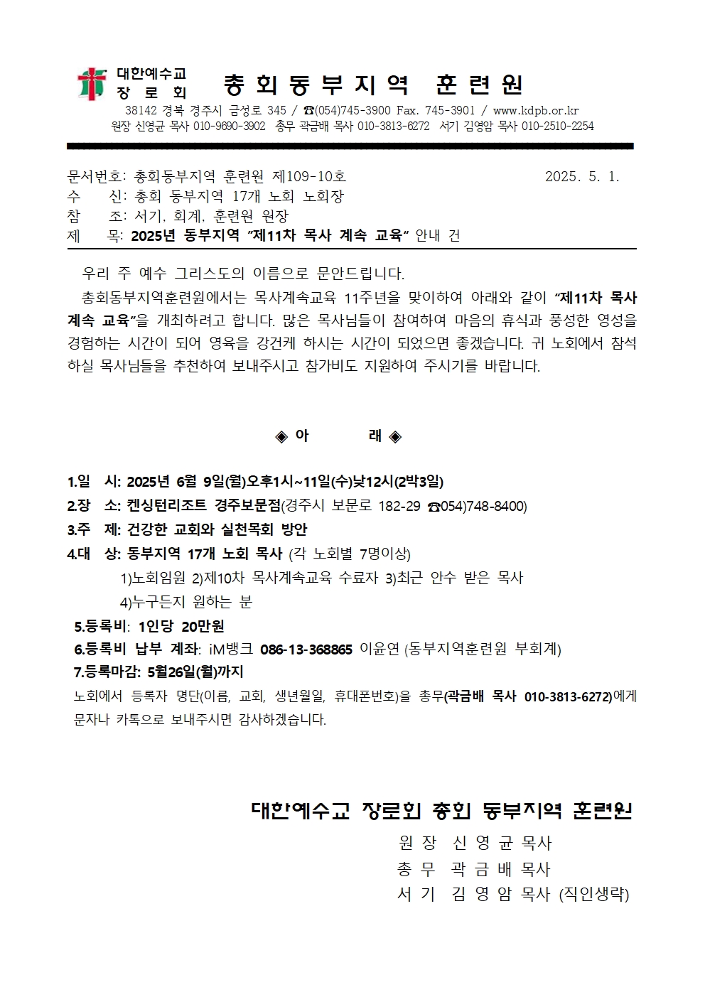 Á¦¸ñ   [°ø¹®] µ¿ºÎÁö¿ª Á¦11Â÷ ¸ñ»ç°è¼Ó±³À°(6/9-11)
