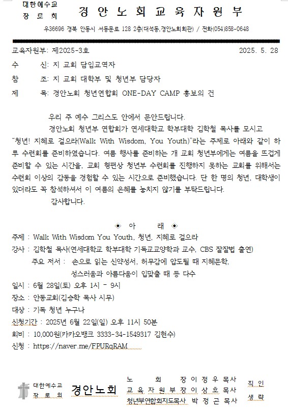 Á¦¸ñ   [°ø¹®] °æ¾È³ëȸ û³â¿¬ÇÕȸ ONE-DAY CAMP È«º¸ÀÇ °Ç(6/28)