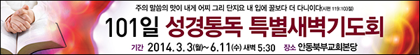 ´«À¸·Î º¸°í ±Í·Î µè°í ÀÔÀ¸·Î Àд 101ÀÏ ¼º°æÅëµ¶ Ưº°»õº®±âµµÈ¸ 2014³â 3¿ù 3ÀÏ(¿ù)~6¿ù 11ÀÏ(¼ö) »õº® 5:30ºÐ ¾Èµ¿ºÏºÎ±³È¸ º»´ç¿¡¼ °®½À´Ï´Ù. 101ÀÏ µ¿¾È ¼º°æÀ» ¿Ïµ¶ÇÒ ¼ö ÀÖ´Â ½Ã°£ÀÔ´Ï´Ù.