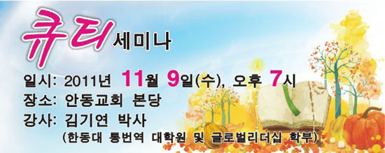 ÀϽà : 2011³â 11¿ù 9ÀÏ(¼ö), ¿ÀÈÄ7½ÃÀå¼Ò : ¾Èµ¿±³È¸ º»´ç°»ç : ±è¿¬¼ö ¹Ú»ç(Çѵ¿´ëÅë¹ø¿ª ´ëÇпø ¹× ±Û·Î¹ú¸®´õ½Ê ÇкÎ)