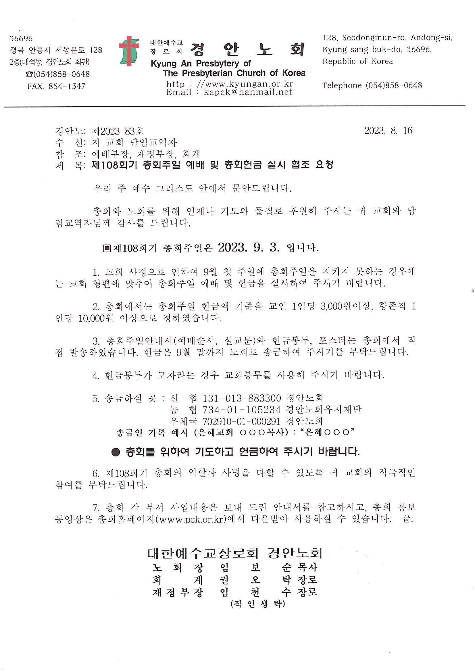 Á¦¸ñ   [°ø¹®] Á¦108ȸ±â ÃÑȸÁÖÀÏ ¿¹¹è ¹× ÃÑȸÇå±Ý ½Ç½Ã ÇùÁ¶ ¿äû(9/3)