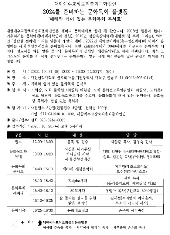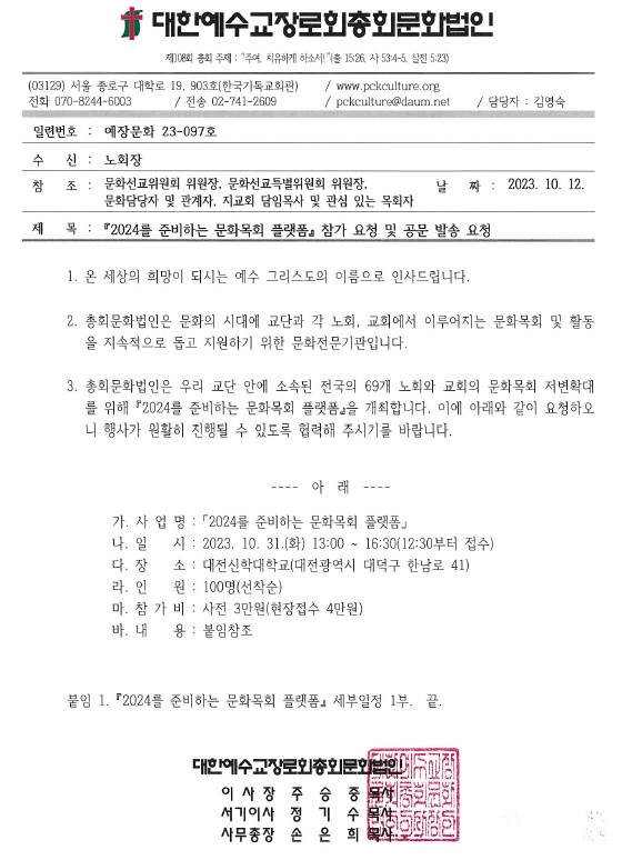Á¦¸ñ   [°ø¹®] 2024¸¦ ÁغñÇÏ´Â ¹®È­¸ñȸ Ç÷§Æû(10/31) Âü°¡ ¿äû