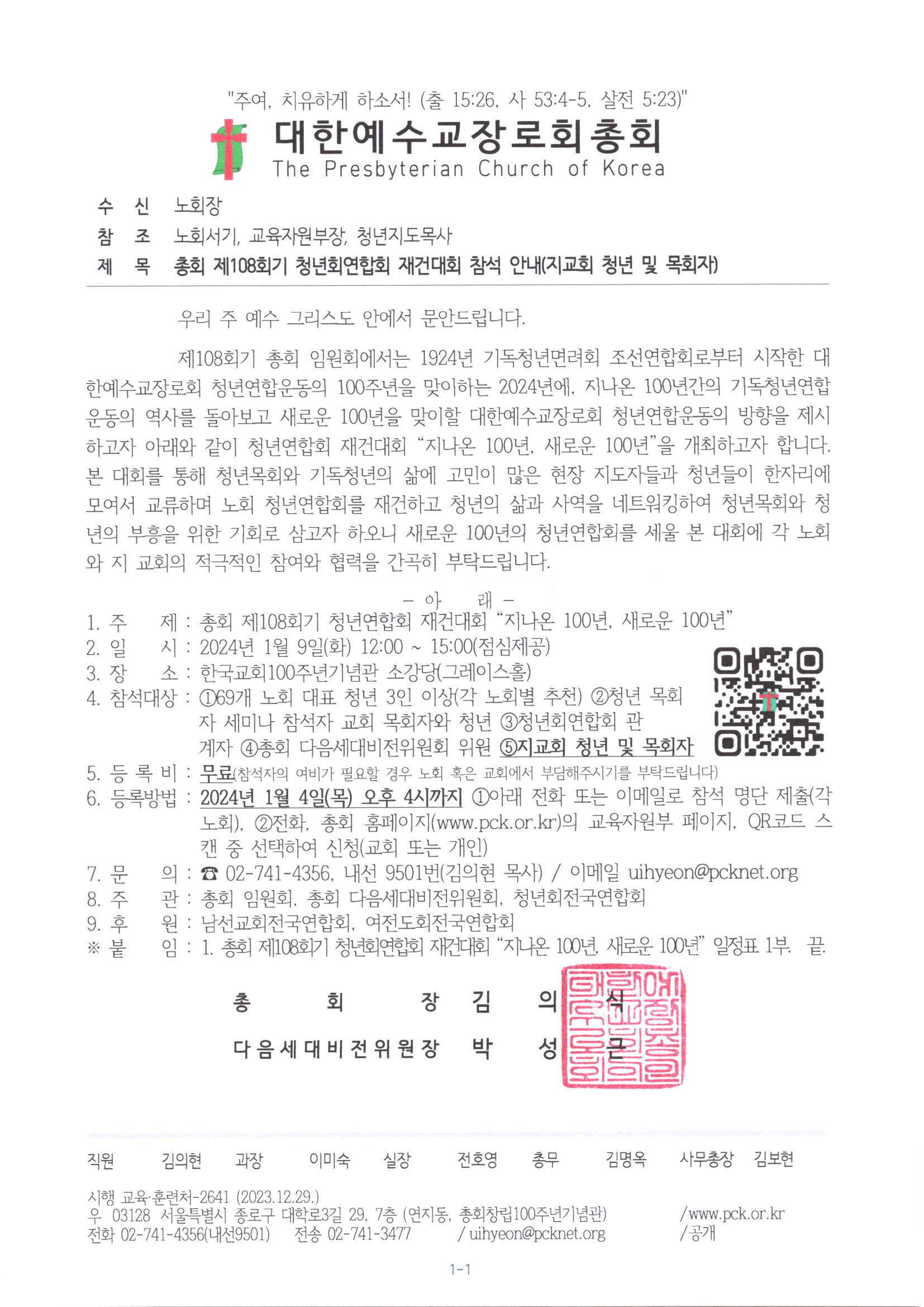 Á¦¸ñ   [°ø¹®] ÃÑȸ Á¦108ȸ±â û³âȸ¿¬ÇÕȸ Àç°Ç´ëȸ(1/9) Âü¼® ¾È³»(Áö±³È¸ û³â ¹× ¸ñȸÀÚ)