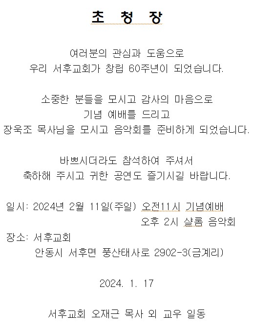 Á¦¸ñ   [°ø¹®] ¼­Èı³È¸ ⸳ 60Áֳ⠱â³ä¿¹¹è ¹× À½¾Çȸ(2/11)