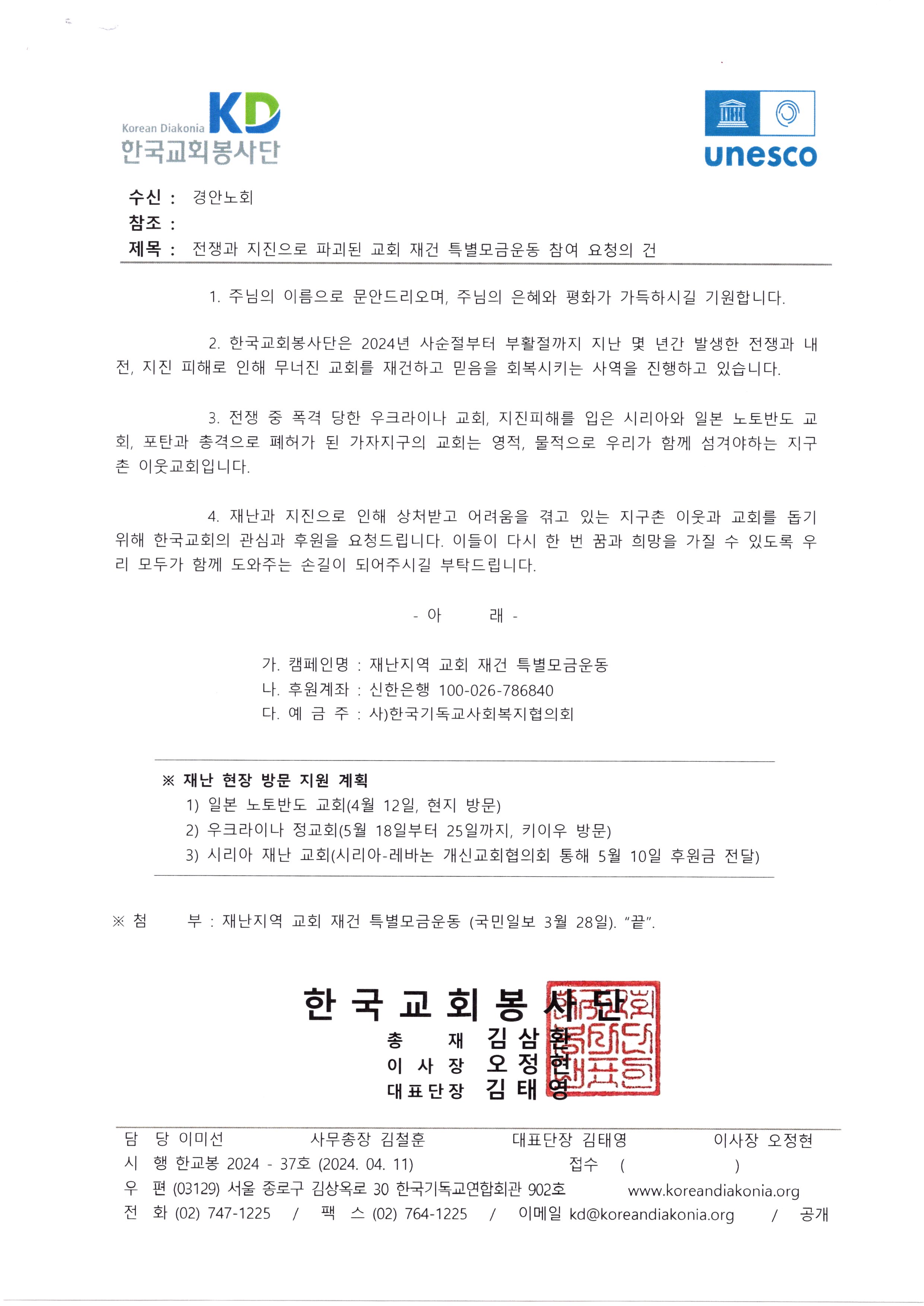 Á¦¸ñ   [°ø¹®] ÀüÀï°ú ÁöÁøÀ¸·Î ÆÄ±«µÈ ±³È¸ Àç°Ç Ưº°¸ð±Ý¿îµ¿ Âü¿© ¿äûÀÇ °Ç