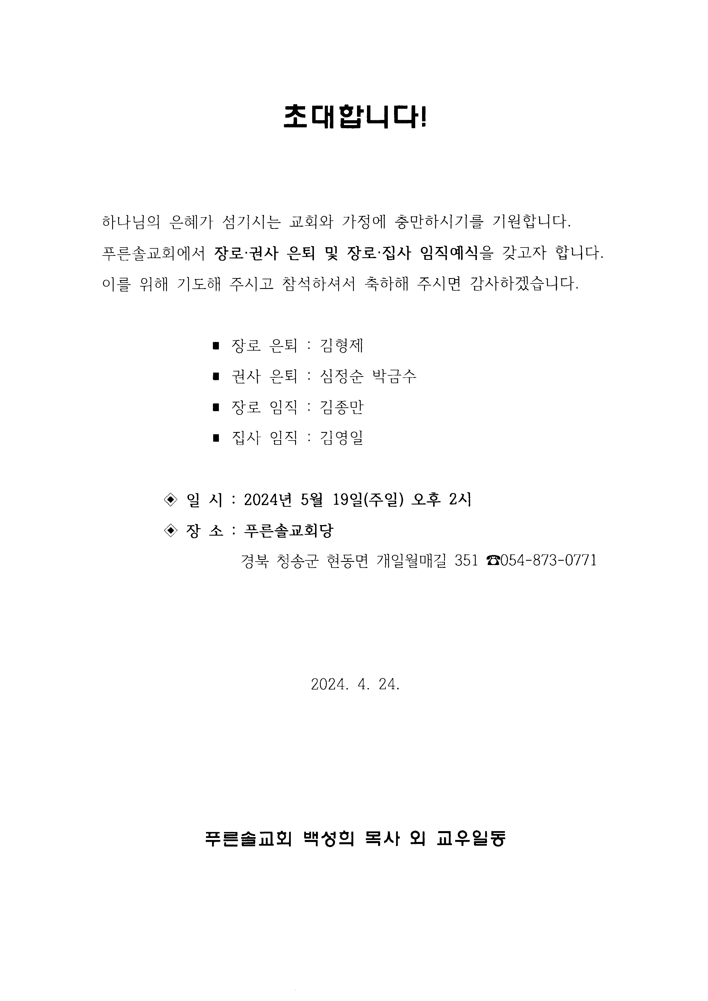 Á¦¸ñ   [°ø¹®] Ǫ¸¥¼Ö±³È¸ ÀºÅð ¹× ÀÓÁ÷¿¹½Ä(5/19)