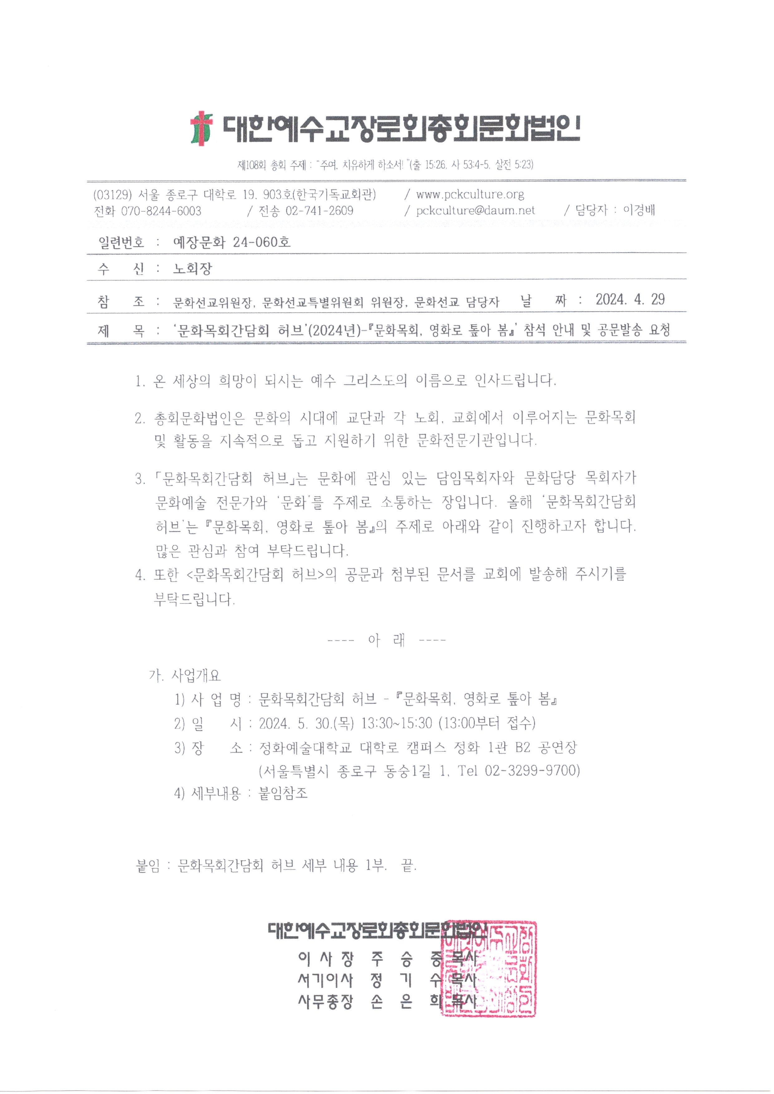 Á¦¸ñ   [°ø¹®] ¹®È­¸ñȸ°£´ãȸ Çãºê(2024³â)-¹®È­¸ñȸ, ¿µÈ­·Î Åì¾Æ º½ Âü¼® ¾È³»(5/30)