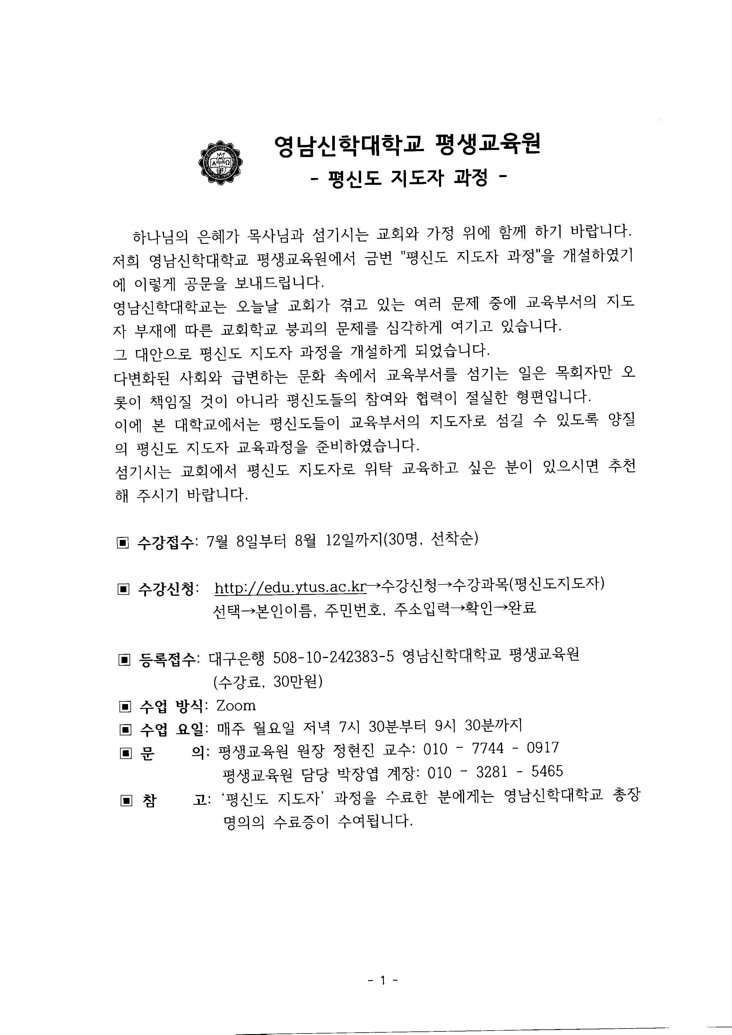Á¦¸ñ   [°ø¹®] ¿µ³²½ÅÇдëÇб³ Æò½ÅµµÁöµµÀÚ °úÁ¤ ¼ö°­»ý Ãßõ ¾È³»