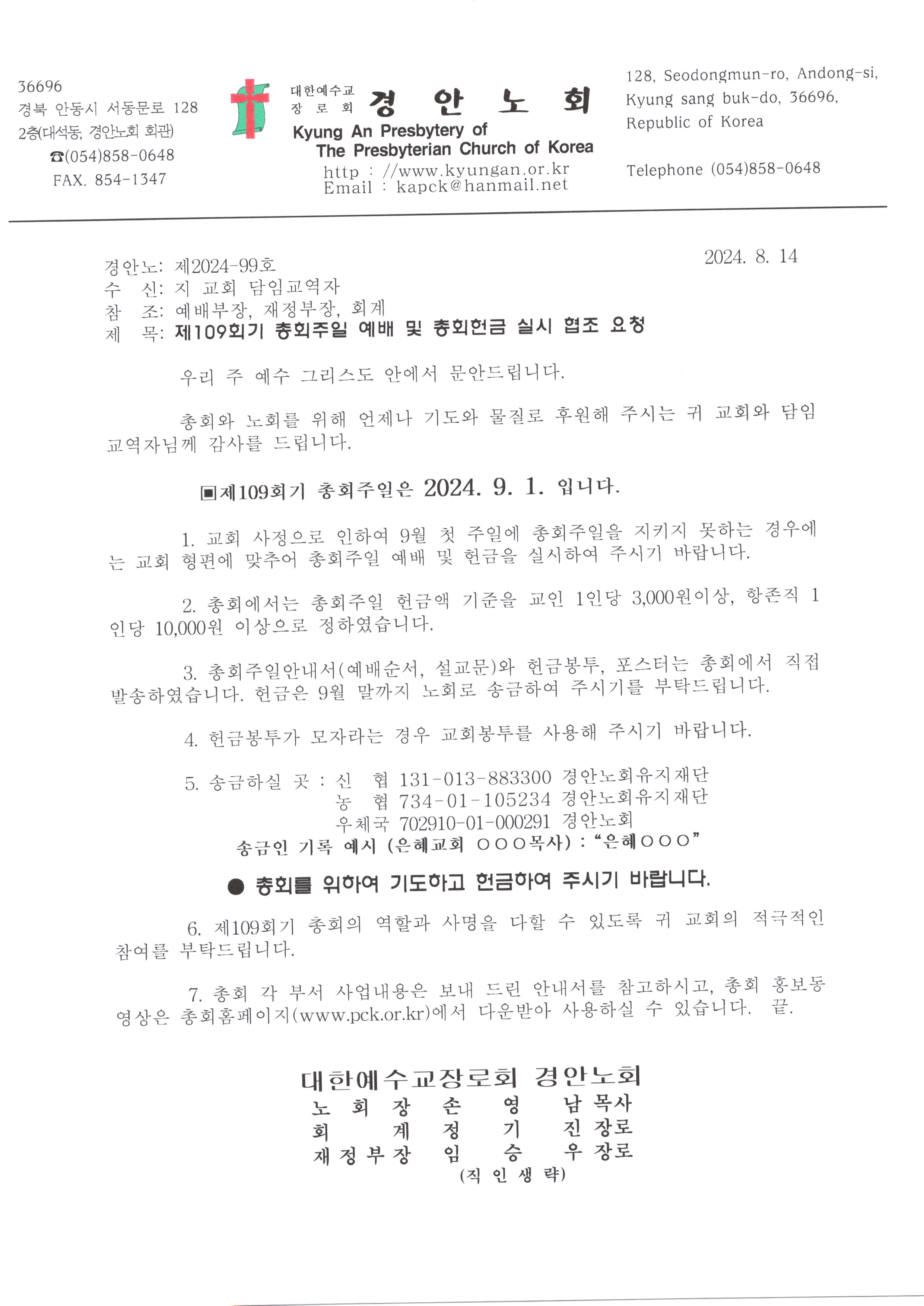 Á¦¸ñ   [°ø¹®] Á¦109ȸ±â ÃÑȸÁÖÀÏ ¿¹¹è ¹× ÃÑȸÇå±Ý ½Ç½Ã ÇùÁ¶ ¿äû(9/1)
