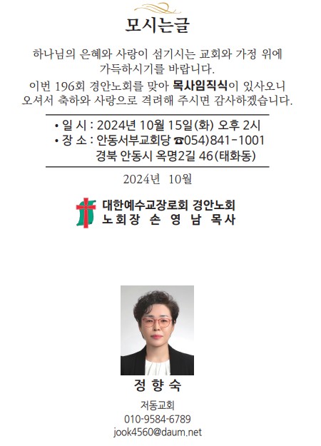 Á¦¸ñ   [°ø¹®] Á¦196ȸ ¸ñ»çÀÓÁ÷ ¿¹Á¤ ¾È³»(10/15)