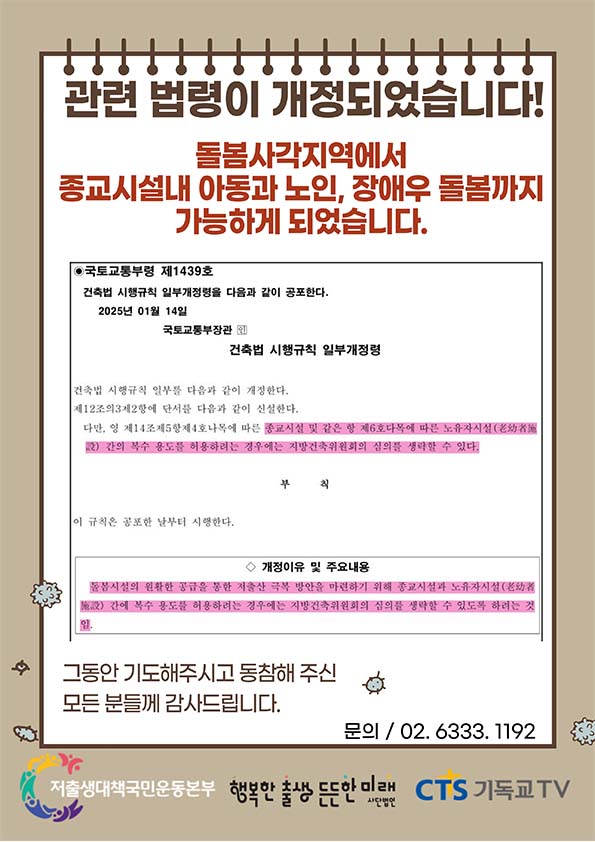 ÀúÃâ»ý À§±â ±Øº¹À» À§ÇØ ÃßÁøÇØ ¿Â <Á¾±³½Ã¼³³» ¾Æµ¿µ¹º½> ÀÔ¹ý°³Á¤ÀÌ "¿À´Ã 1¿ù 14ÀÏ ±¹ÅäºÎ·É Á¦1439È£ °ÇÃà¹ý ½ÃÇà±ÔÄ¢ ÀϺΰ³Á¤·ÉÀ¸·Î °øÆ÷"µÇ¾ú½À´Ï´Ù!