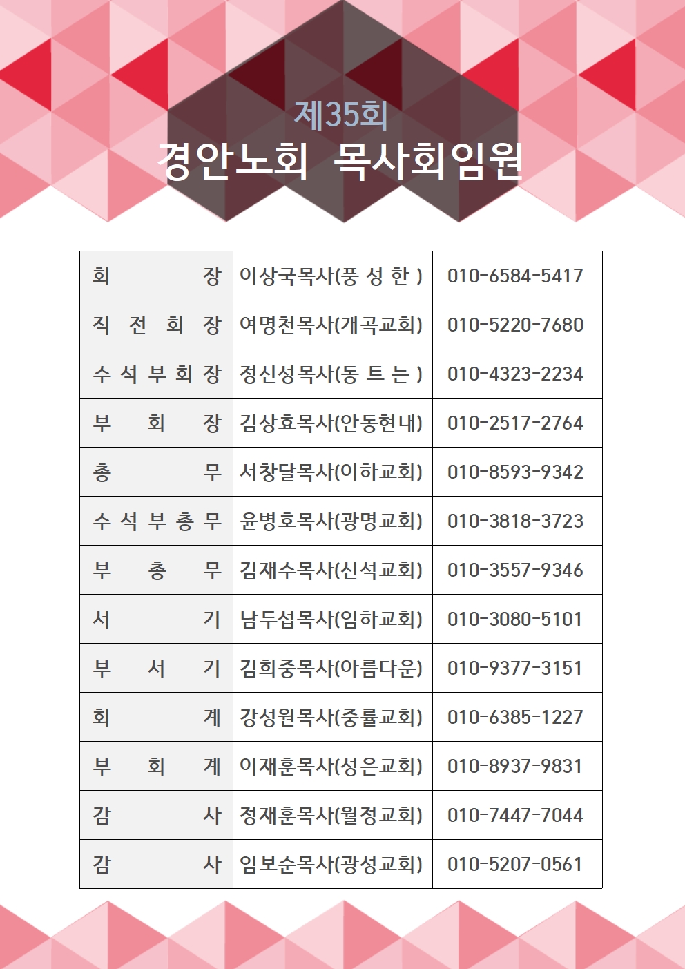 Á¦¸ñ   [ÀϹÝ] Á¦35ȸ °æ¾È³ëȸ ¸ñ»çȸ ÀÓ¿ø