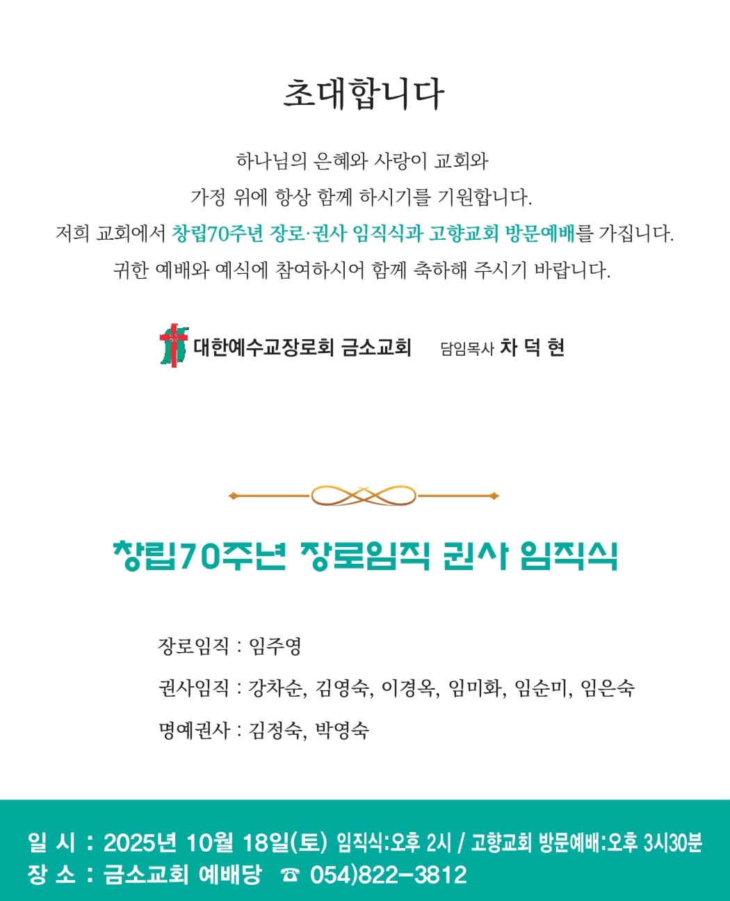 Á¦¸ñ   [°ø¹®] ±Ý¼Ò±³È¸ ⸳70ÁÖ³â Àå·Î.±Ç»ç ÀÓÁ÷½Ä°ú °íÇⱳȸ ¹æ¹®¿¹¹è(10/18)