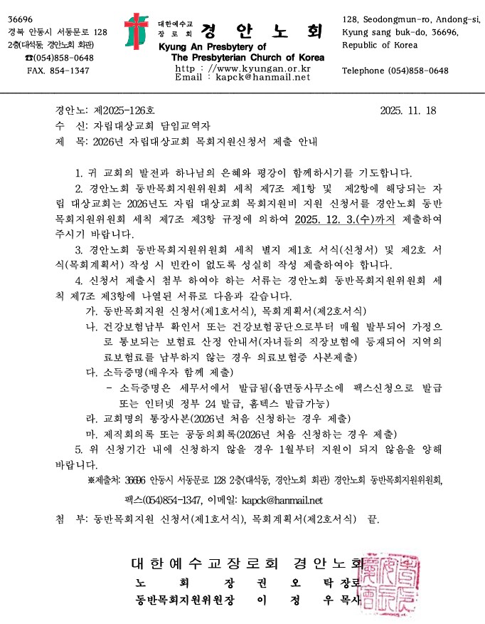 Á¦¸ñ   [°ø¹®] 2026³â ÀÚ¸³´ë»ó±³È¸ ¸ñȸÁö¿ø½Åû¼­ Á¦Ã⠾ȳ»(12/3±îÁö)