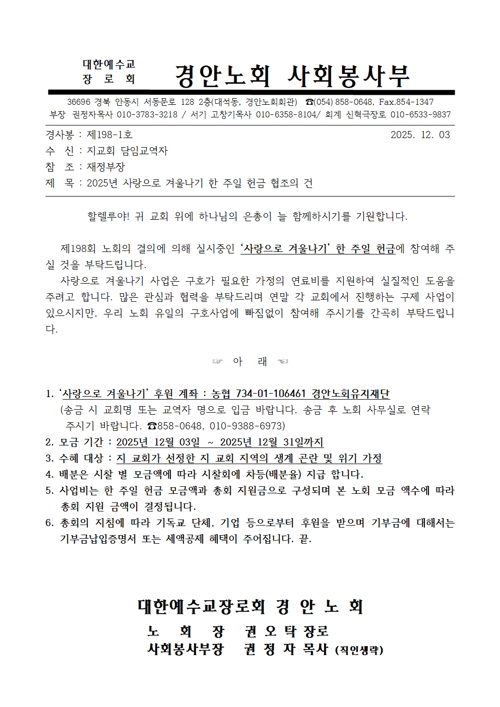 Á¦¸ñ   [°ø¹®] 2025³â »ç¶ûÀ¸·Î °Ü¿ï³ª±â ÇÑ ÁÖÀÏ Çå±Ý ÇùÁ¶ÀÇ °Ç(12.3-12.31±îÁö)