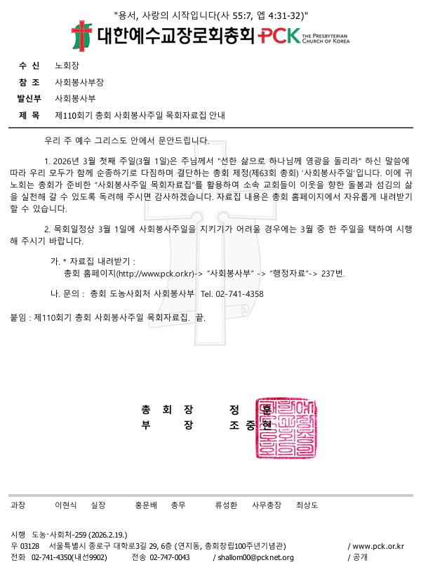 2026³â 3¿ù ù° ÁÖÀÏ(3¿ù 1ÀÏ)Àº ÃÑȸ°¡ Á¦Á¤ÇÑ »çȸºÀ»çºÎ ÁÖÀÏÀÔ´Ï´Ù. Á¦110ȸ±â ÃÑȸ»çȸºÀ»çÁÖÀÏ ¸ñȸÀÚ·áÁý